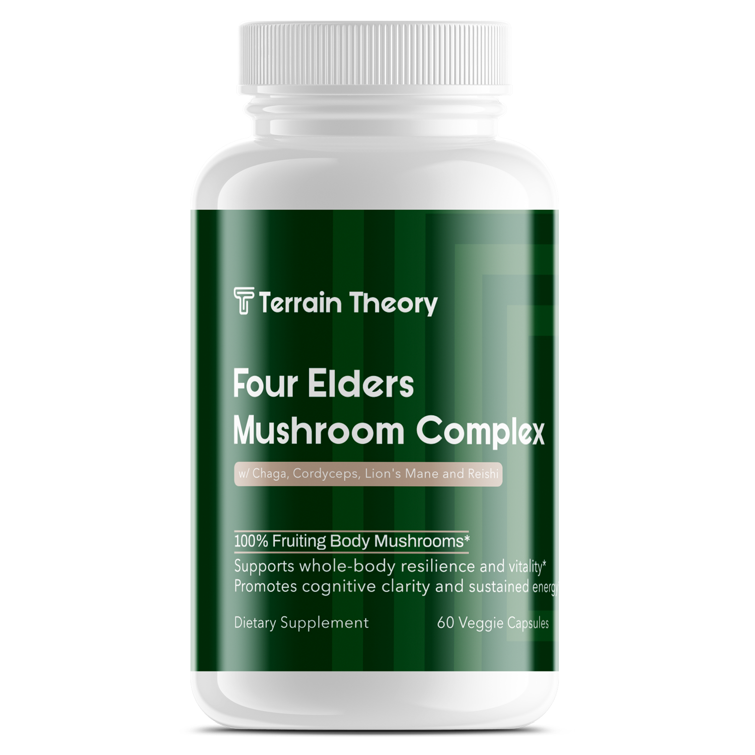 Four Elders Mushroom Complex is formulated to support terrain health, antioxidant activity, balanced estrogen levels, reduced stress, improved exercise performance, and blood sugar regulation.